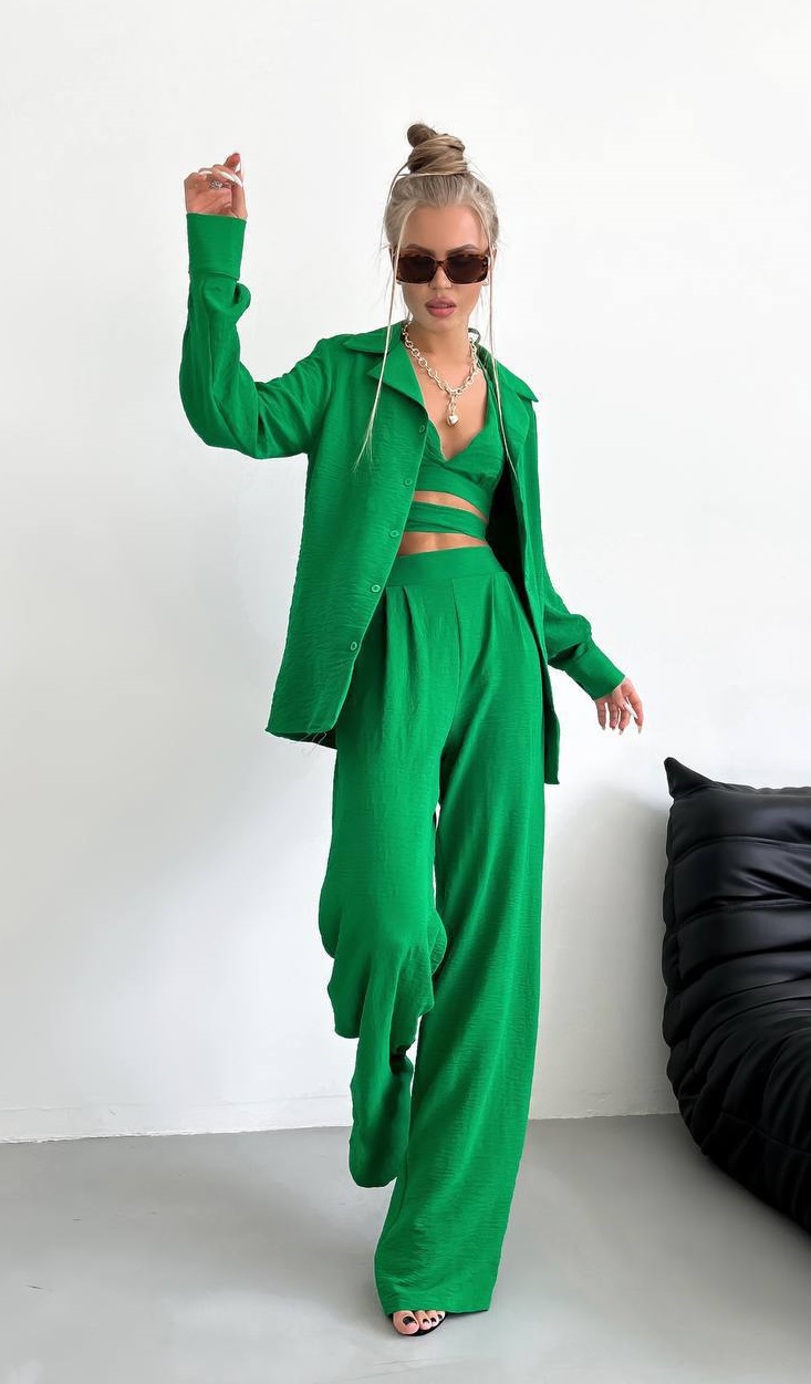 Костюм тройка оригинального кроя рубашка + топ + штаны зеленый