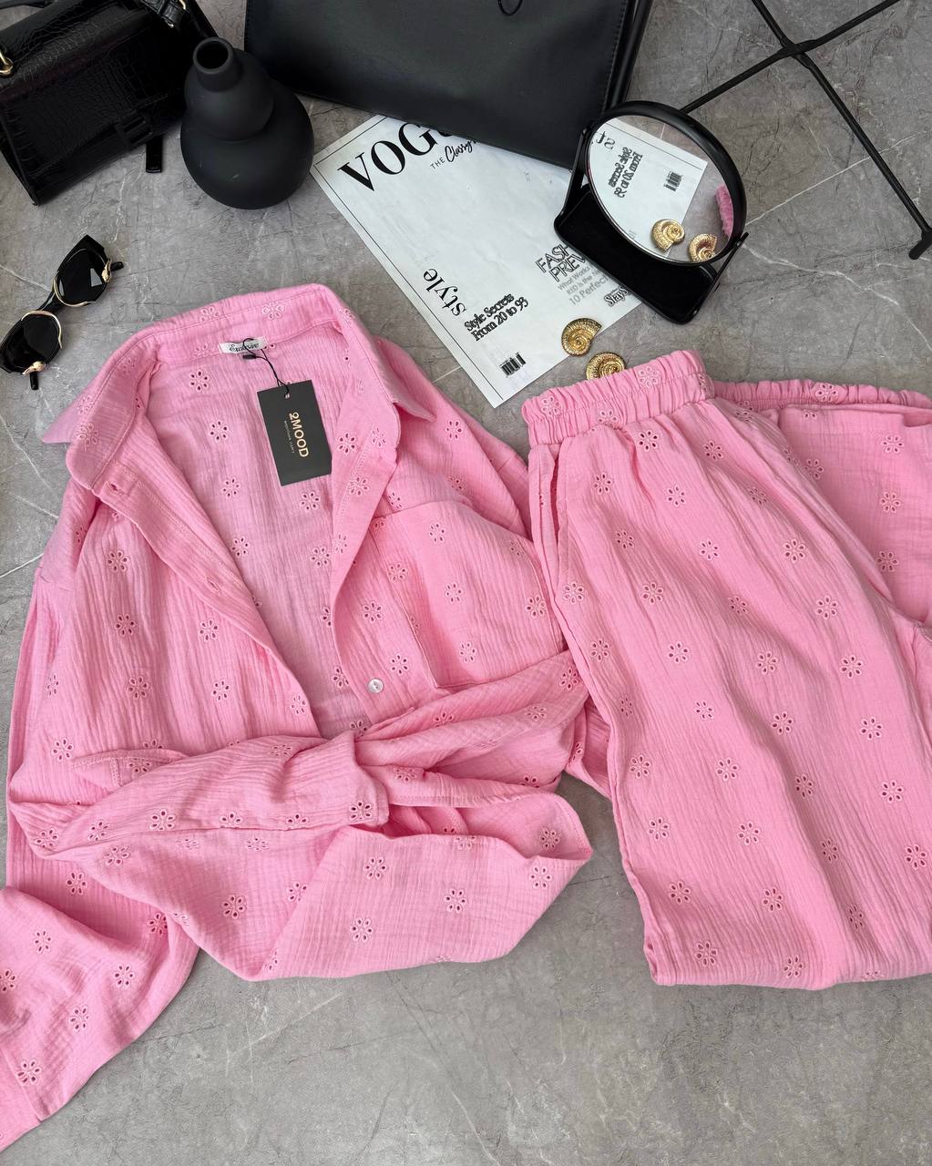 Костюм тройка (рубашка, топ и брюки) из натуральной ткани, идеальная находка на лето. Приятный к телу, не парит и не мнется. Рубашка на пуговицах. Топ и брюки на резинке. Идет свободный фасон.