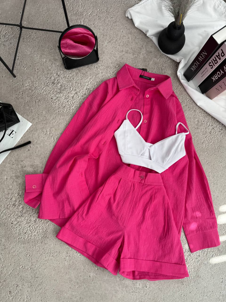 Костюм тройка: рубашка с длинным рукавом и манжетом+шорты с боковыми карманами малина