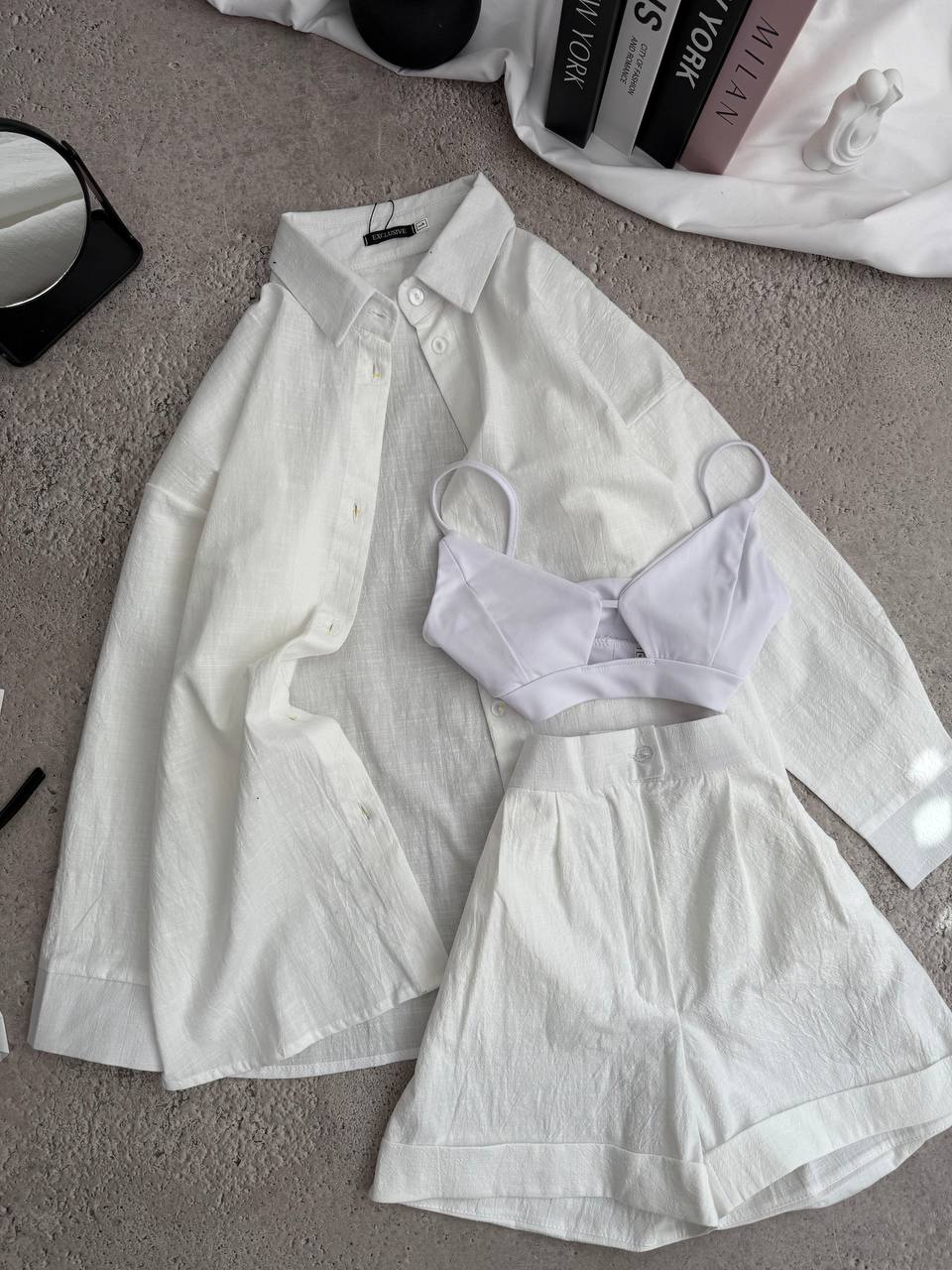 Костюм тройка: рубашка с длинным рукавом и манжетом, шорты с боковыми карманами.