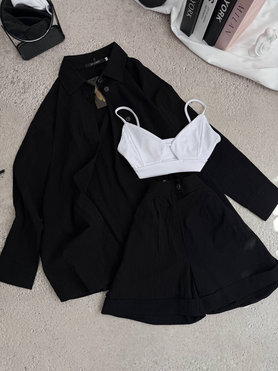 Костюм тройка: рубашка с длинным рукавом и манжетом, шорты с боковыми карманами.