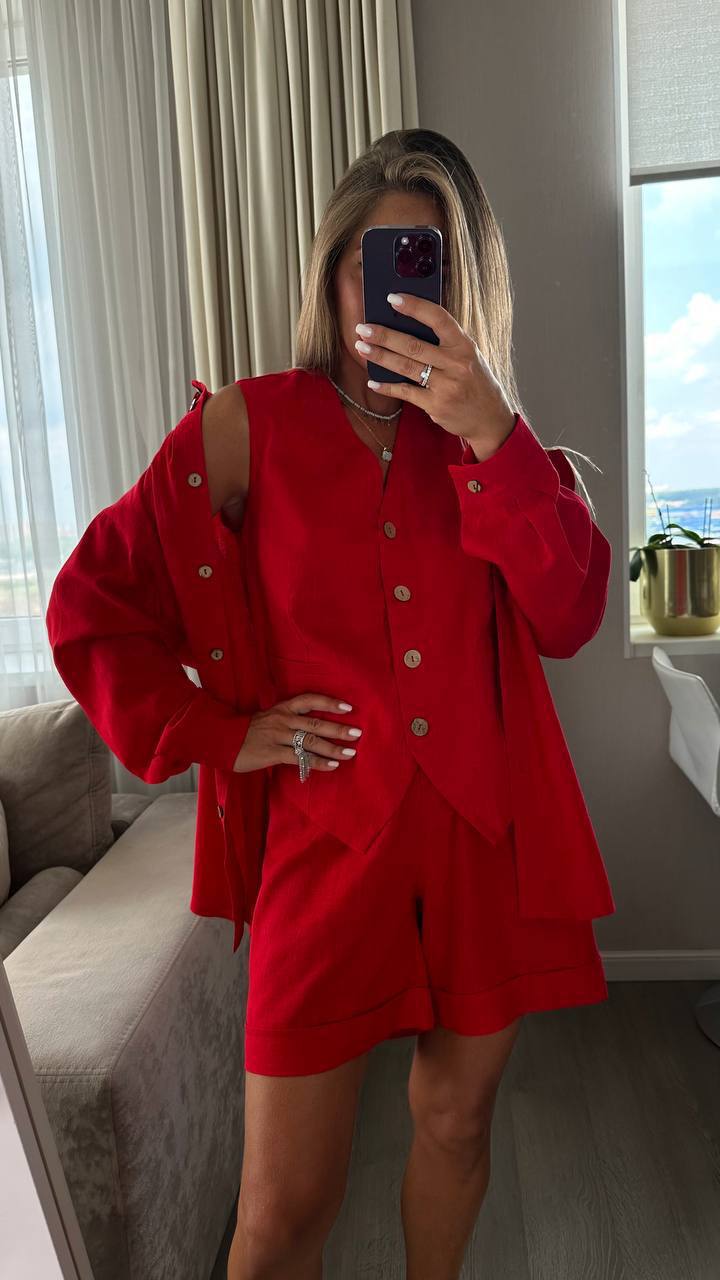 Костюм тройка (рубашка+жилетка+шорты) лен красный