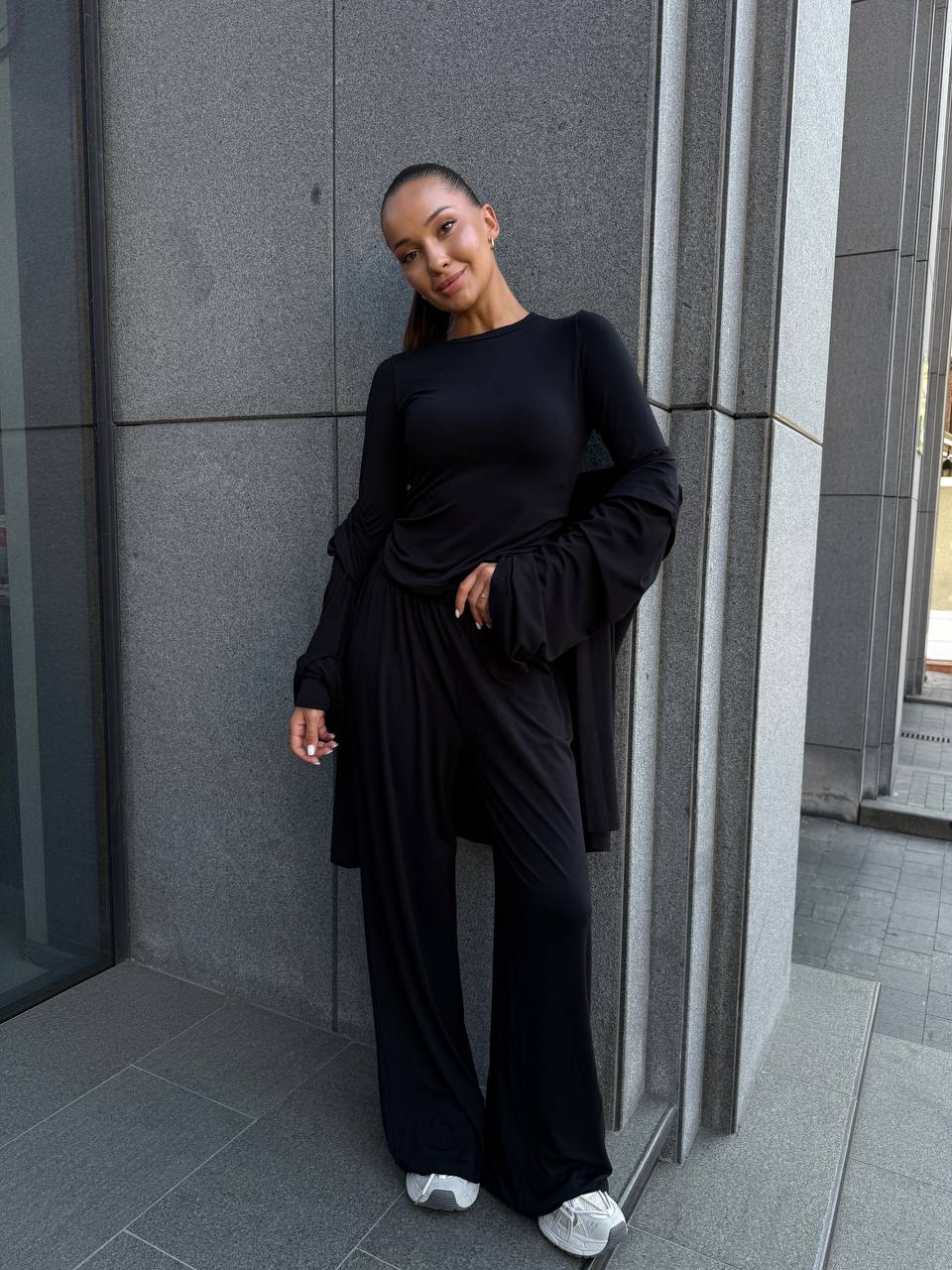 Состоят из лонга, штанов палаццо и кардигана с капюшоном.