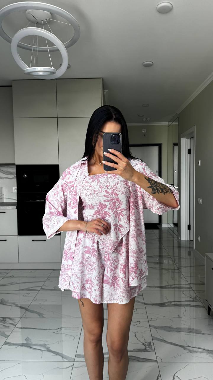 Будьте першим, хто залишив відгук “Костюм тройка (шорты+рубашка+платок) с цветочным принтом розовый”“
