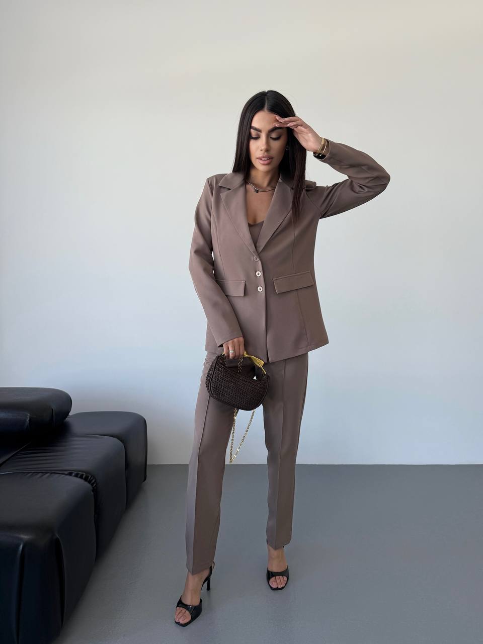 Костюм-тройка: топ+брюки сзади на резинке+пиджак с подплечниками мокко