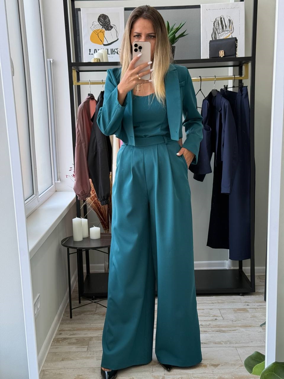 Костюм тройка (топ+свободные брюки+укороченный пиджак) изумруд