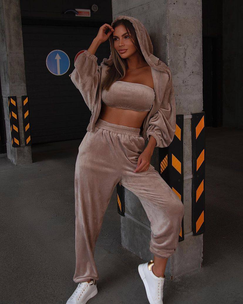 Наша новинка – костюм тройка который состоит из удобного худи, стильных джогеров и топа. Костюм создан из плотной ткани, которая обеспечивает комфорт и удобство.