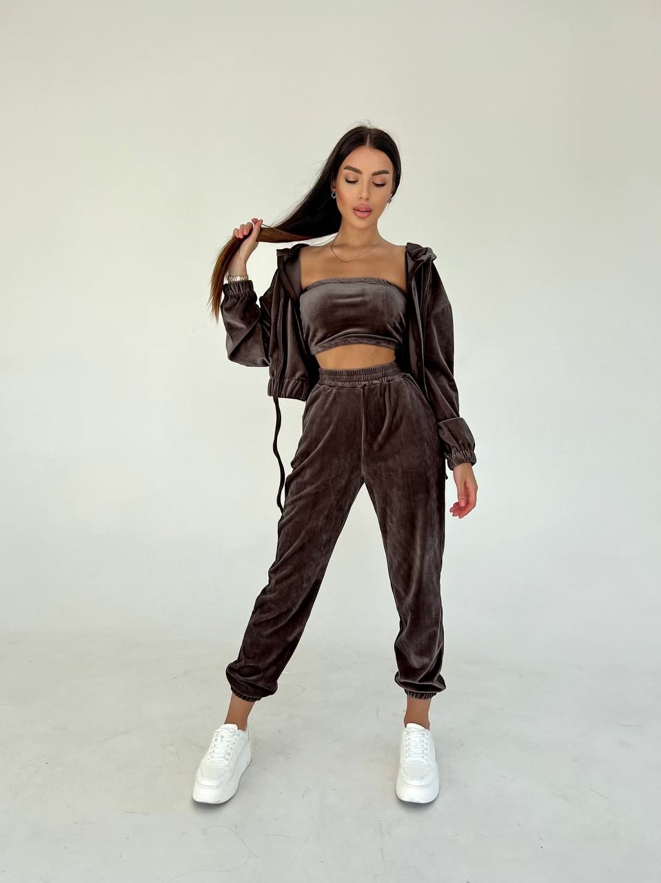 Наша новинка – костюм тройка который состоит из удобного худи, стильных джогеров и топа.