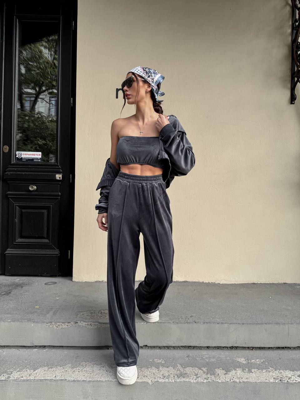 Очень крутой и комфортный костюм тройка состоящий из тощи, брюк и топа. Костюм создан из плотной ткани, которая обеспечивает комфорт и удобство.