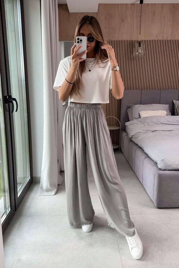 Костюм (укороченная футболка+брюки свободного кроя талия на резинке) белый+серый