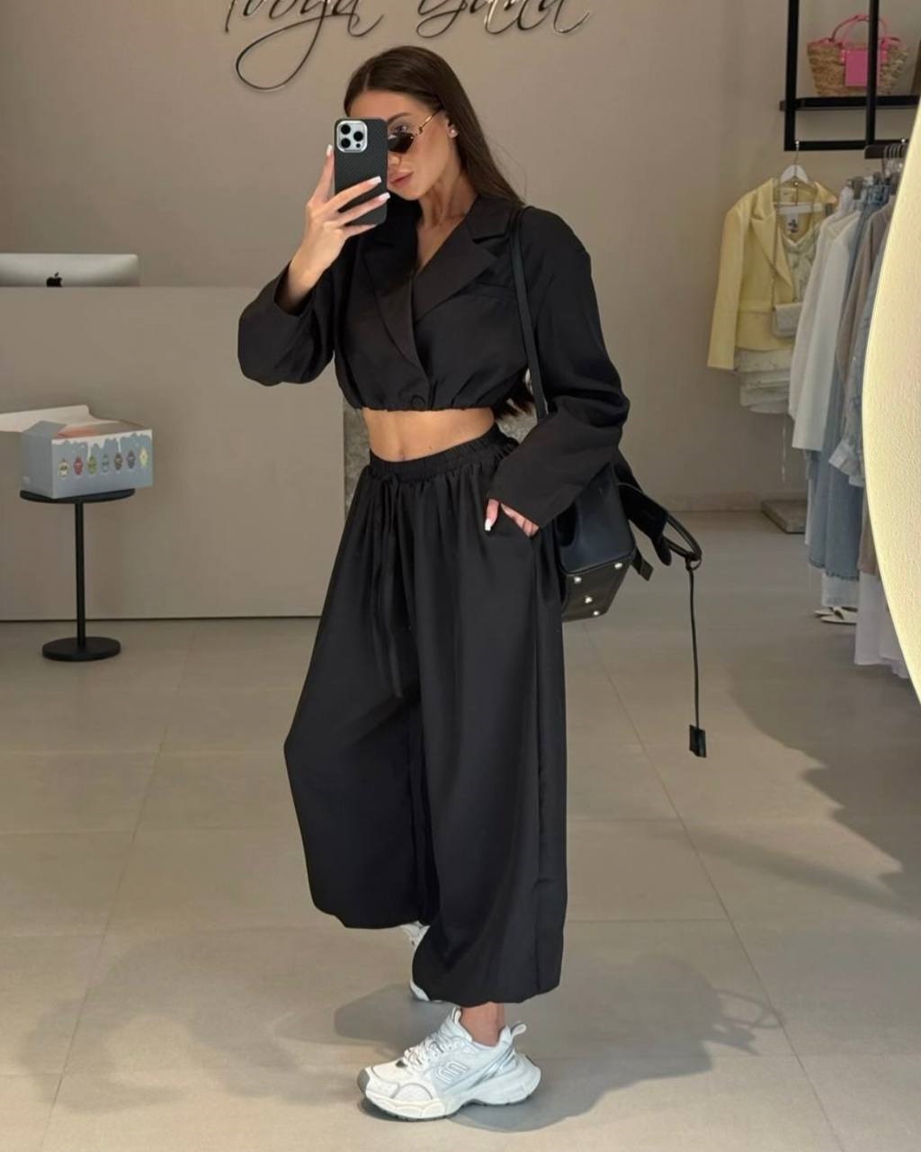 Костюм (укороченный пиджак и широкие плечи+брюки снизу на резинке) черный