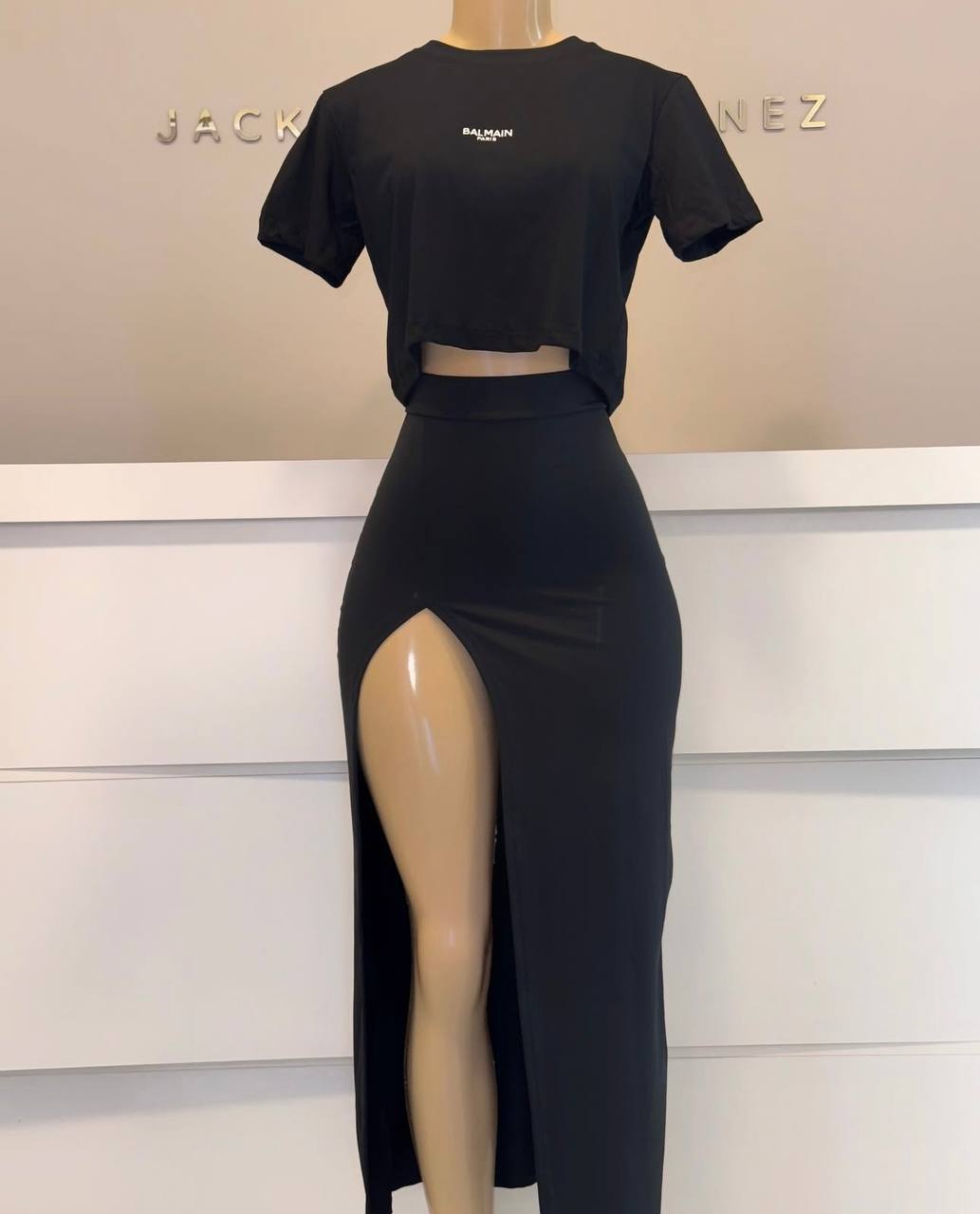Идеальный костюм к весне – укороченный свободный топ и юбка с разрезом. Ткань приятна к телу и хорошо тянется. Надпись сделана из накатки!