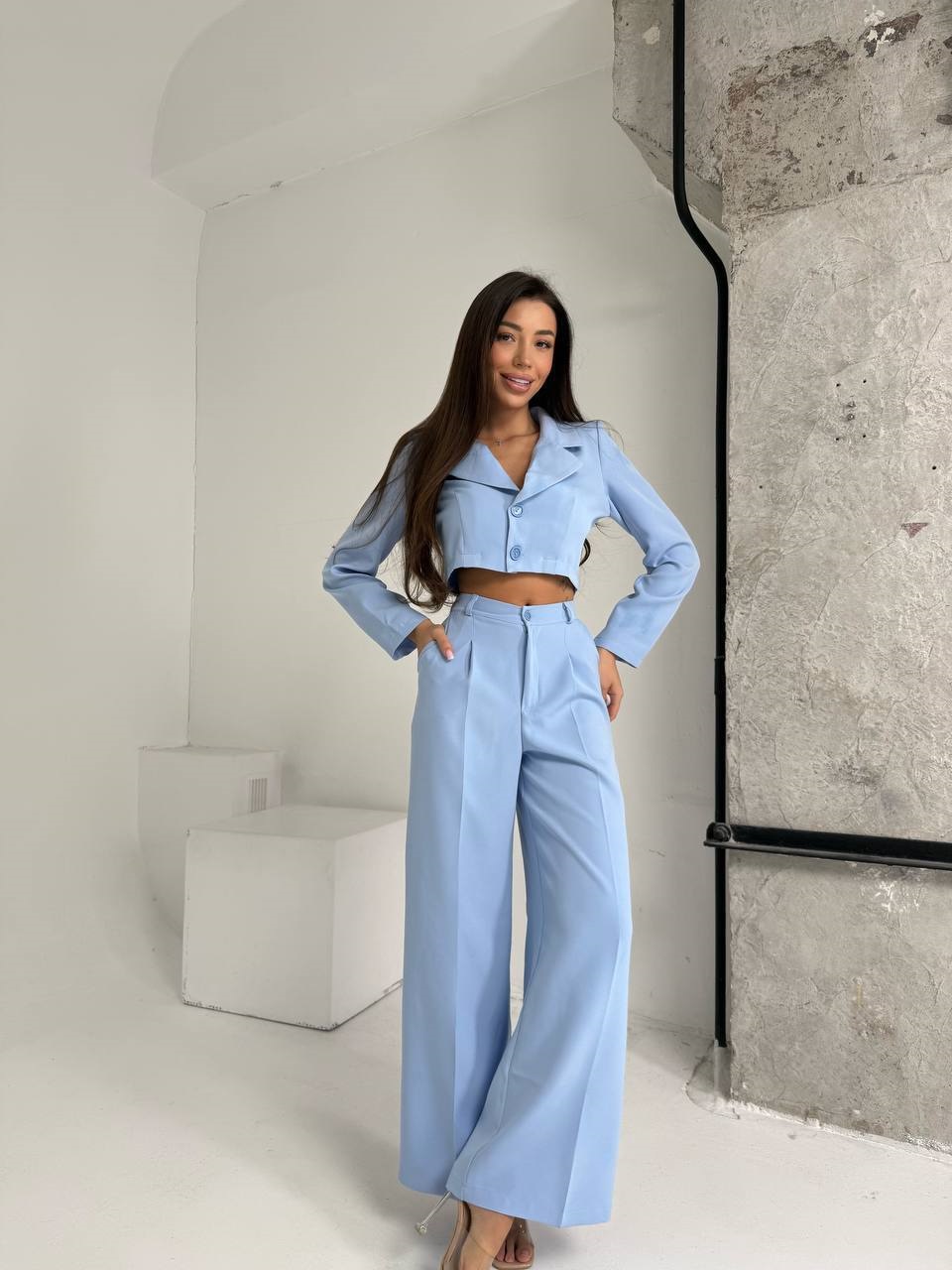 Головна » Магазин » Одяг » Жіночі костюми » Костюм (укороченным жакет с английским воротником+брюки) голубой