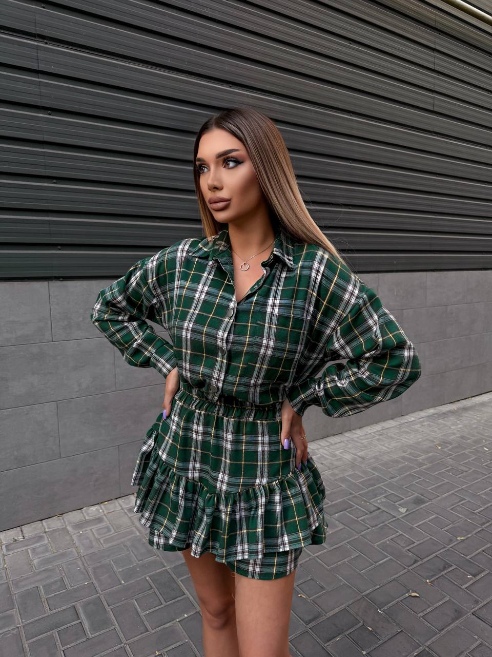 Костюм в клетку: рубашка с манжетами на пуговицах+юбка с оборкой зеленый