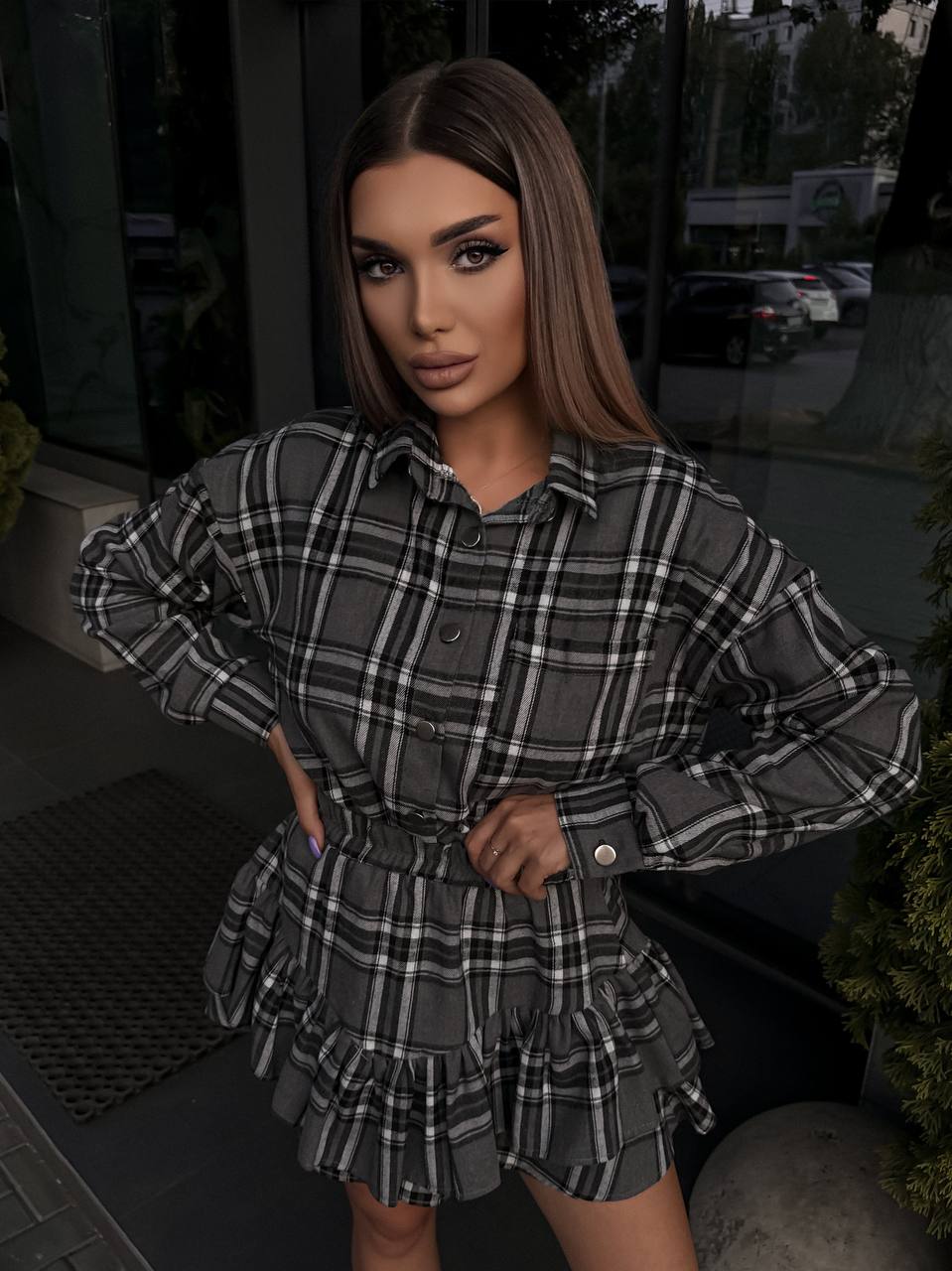 Костюм в клетку: рубашка с манжетами на пуговицах+юбка с оборкой серый