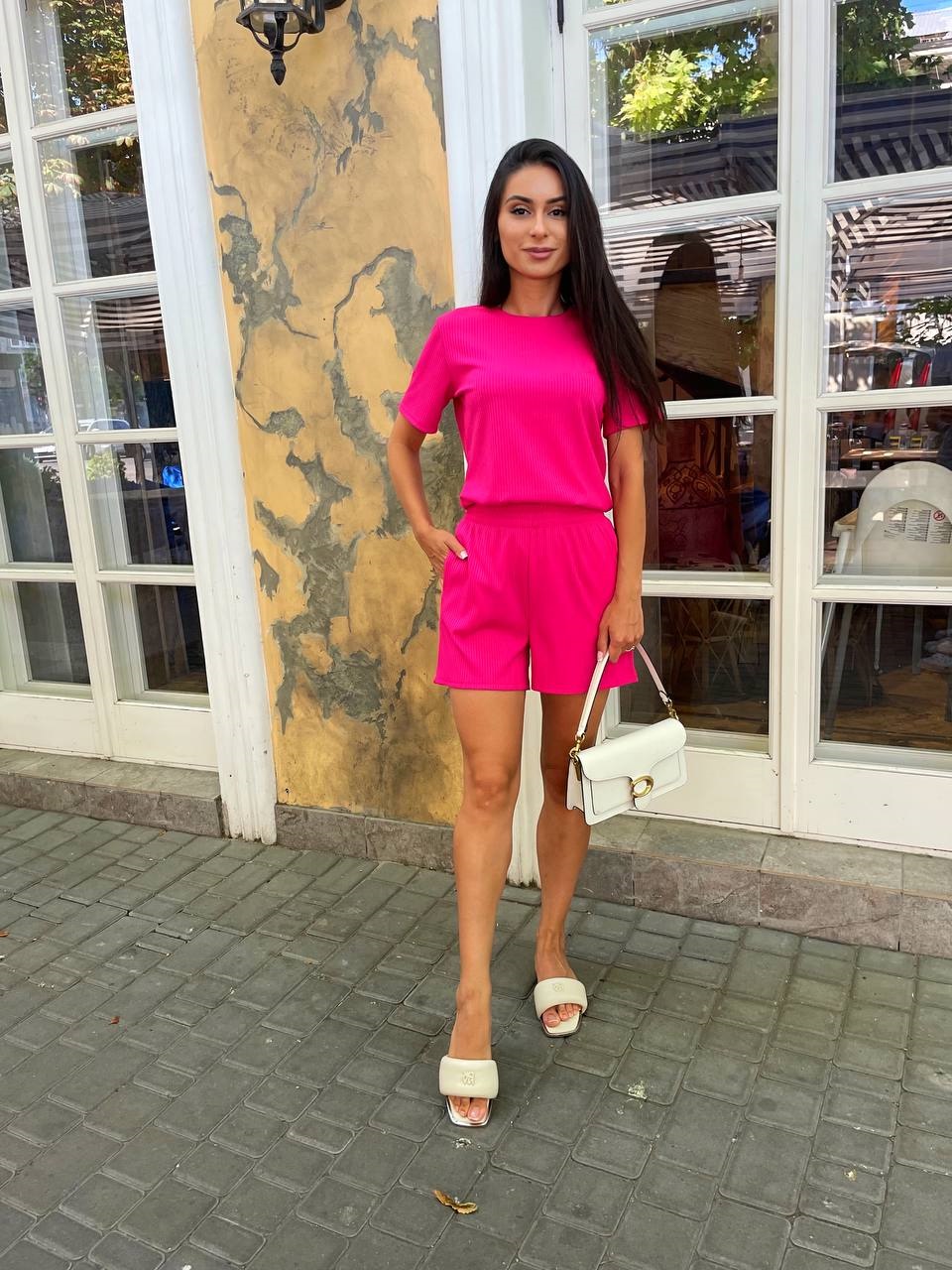 Головна » Магазин » Одяг » Жіночі костюми » Костюм в рубчик (шорты с карманами+футболка с коротким рукавчиком) розовый