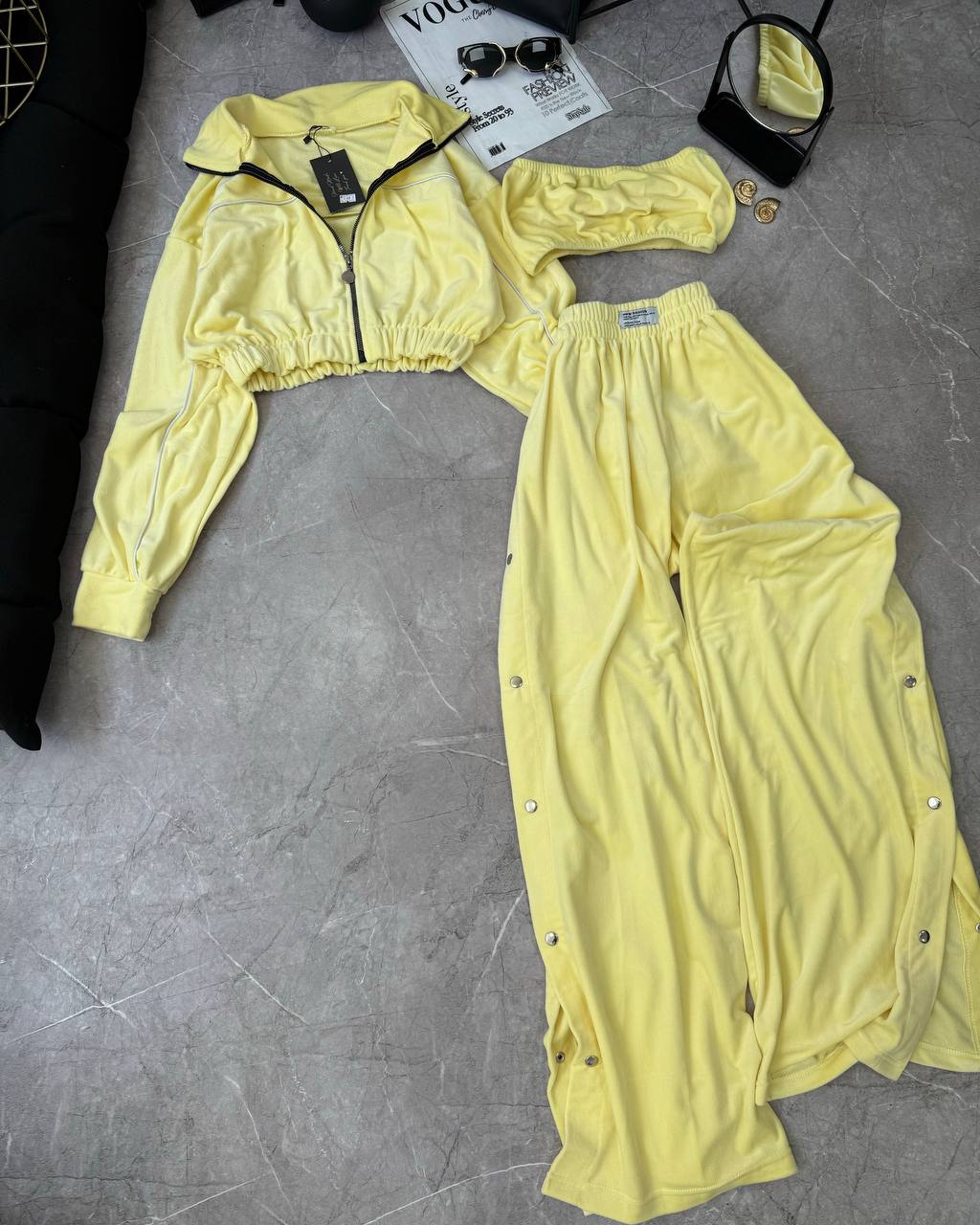Костюм велюровый тройка: кофта+топ-бандо+штанов на заклепках по бокам лимон