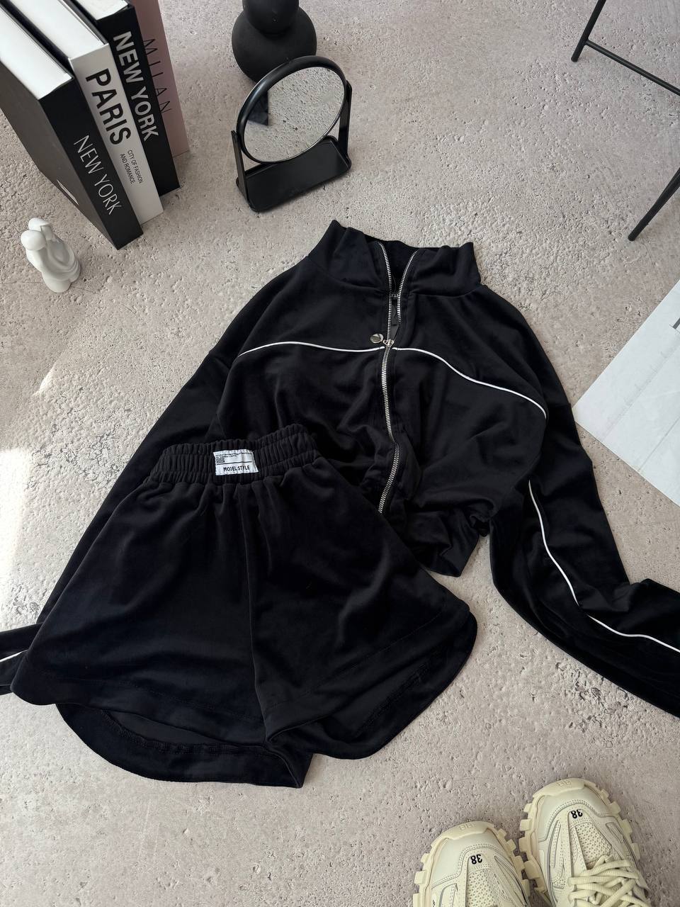 Костюм велюровый: Укороченная кофта на змейке+Шорты на резинке и кнопках по бокам черный