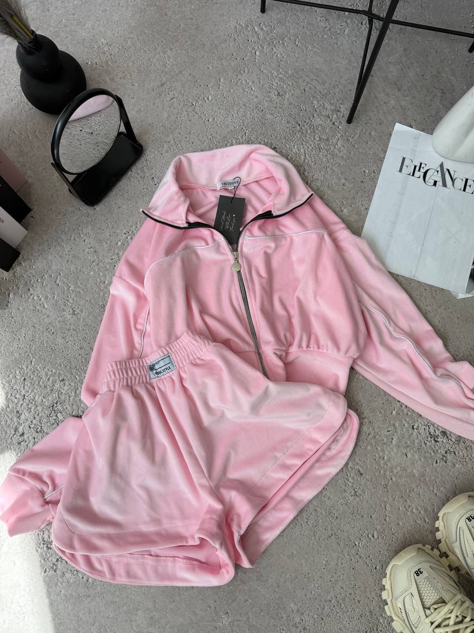 Костюм велюровый: Укороченная кофта на змейке+Шорты на резинке и кнопках по бокам Барби