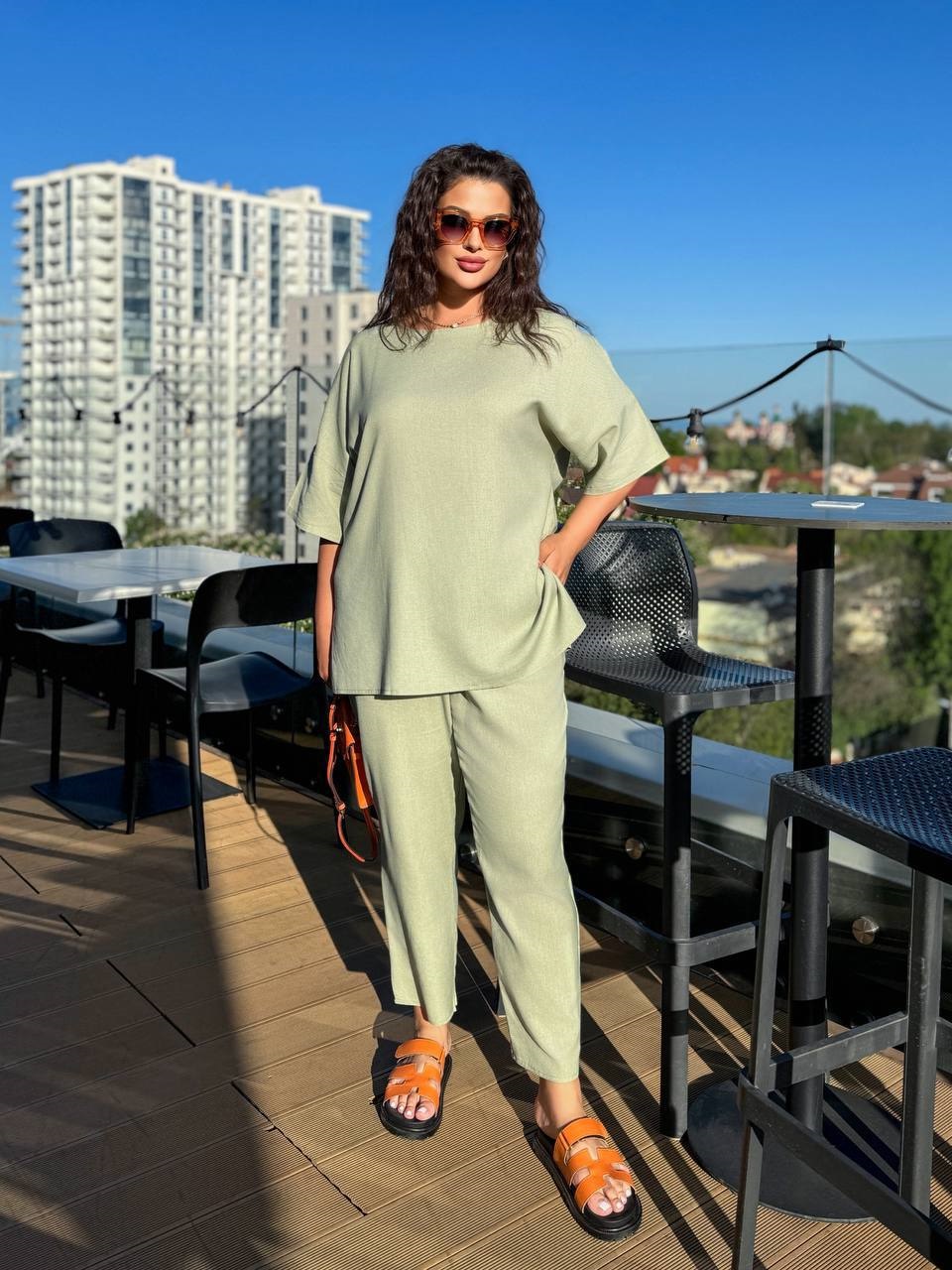 Костюм (зауженные брюки с карманами+кофта свободного кроя) оливка