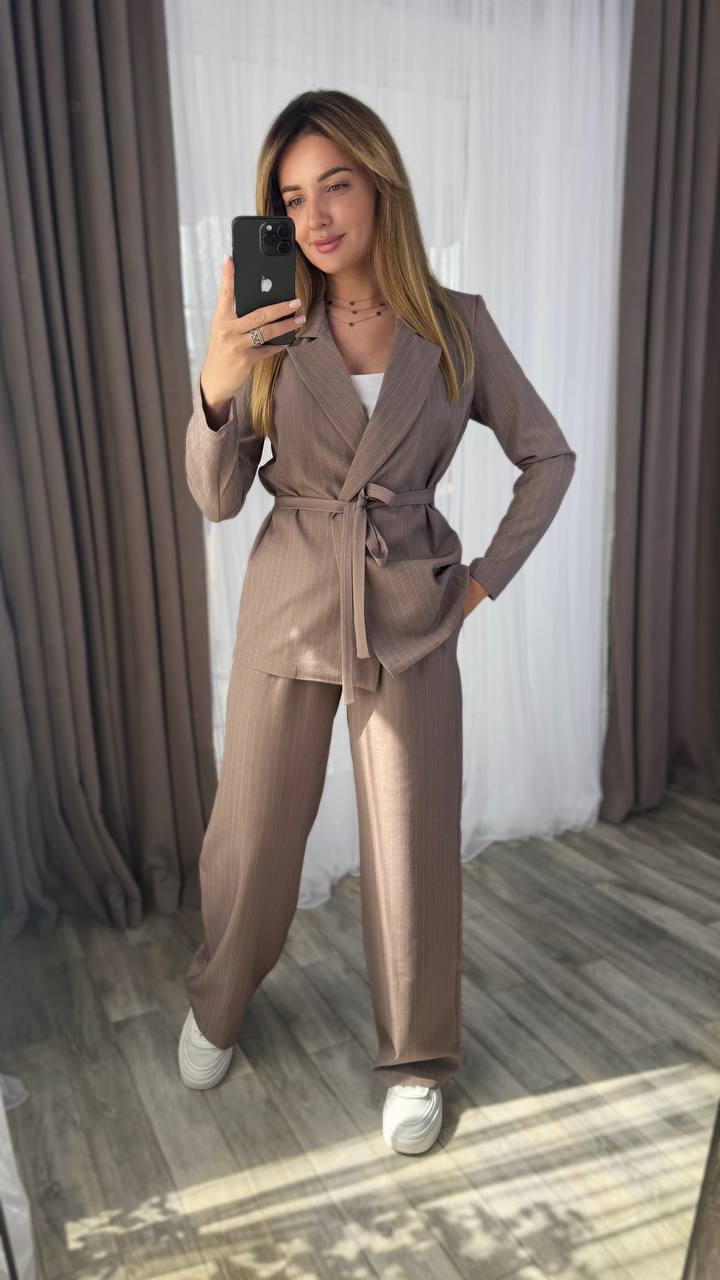 Костюм жакет без подкладки на запах+брюки свободного кроя мокко