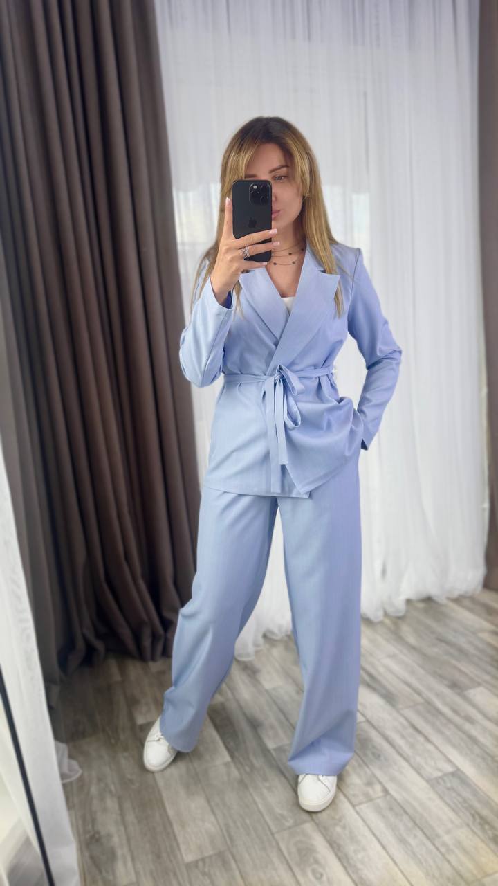 Костюм жакет без подкладки на запах+брюки свободного кроя голубой