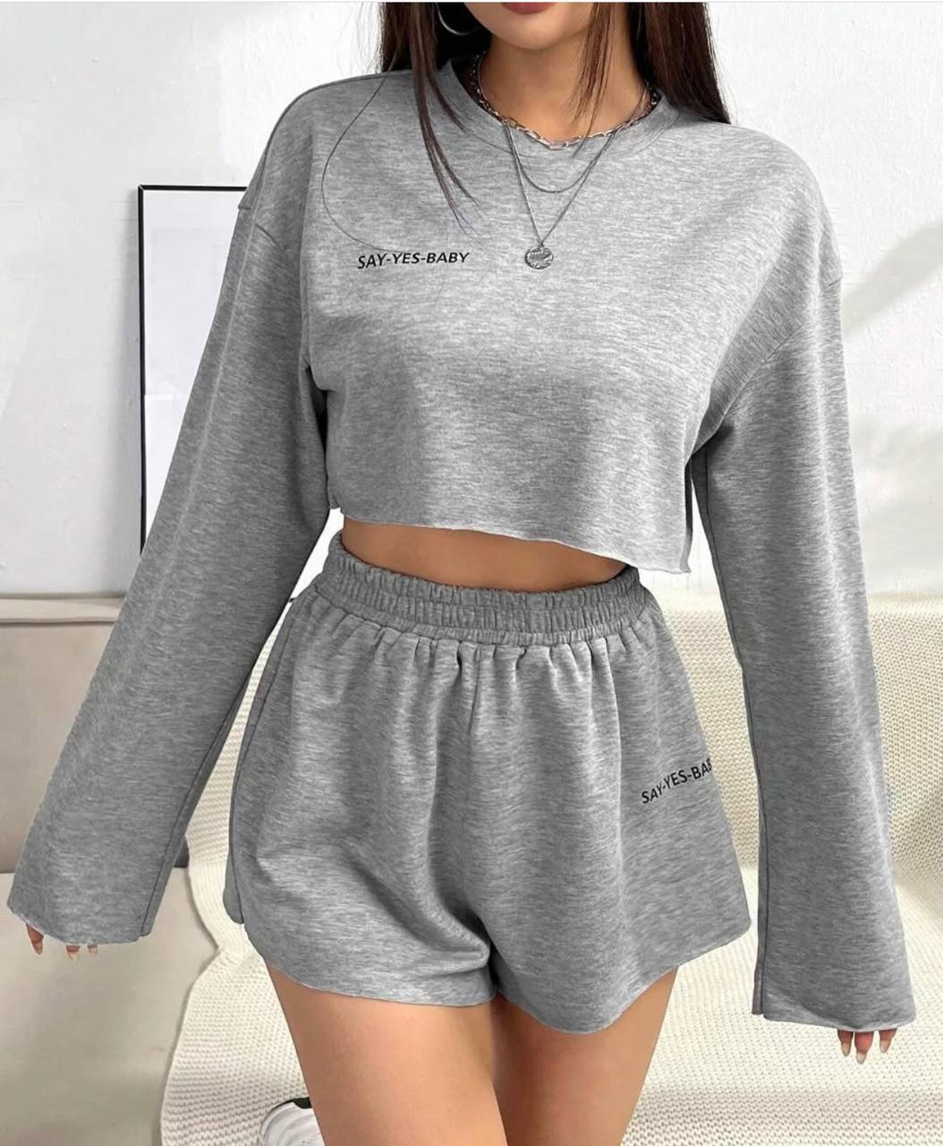 Костюмчик из кофты и шортиков свободного фасона серый меланж