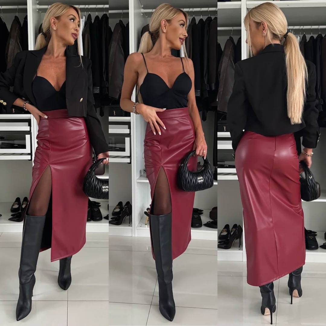 Головна » Магазин » Одяг » Спідниці шортів » Кожаная юбка длиной миди с разрезом марсала