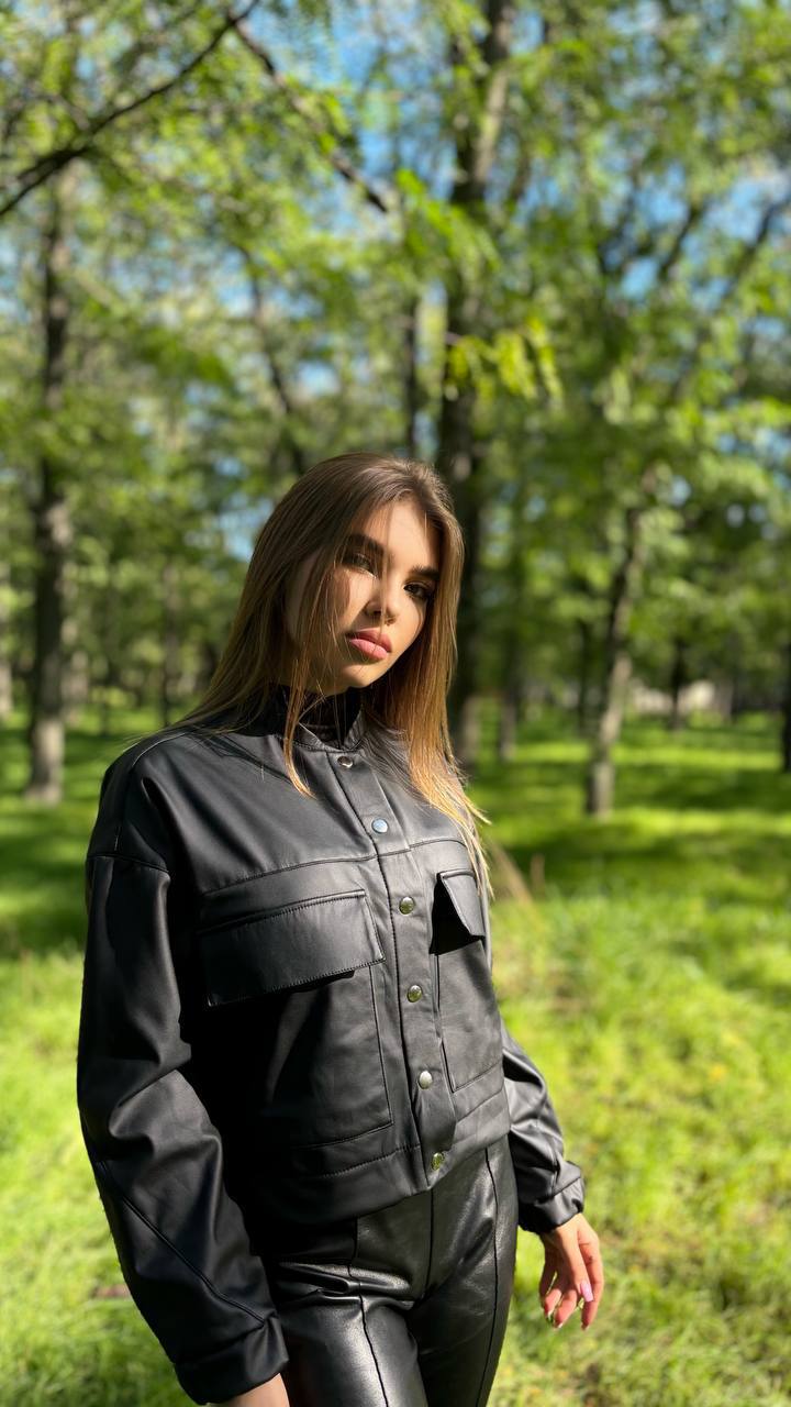Головна » Магазин » Одяг » Жіночий верхній одяг » Кожаный бомбер на кнопках с крупными карманами+воротник стойка черный