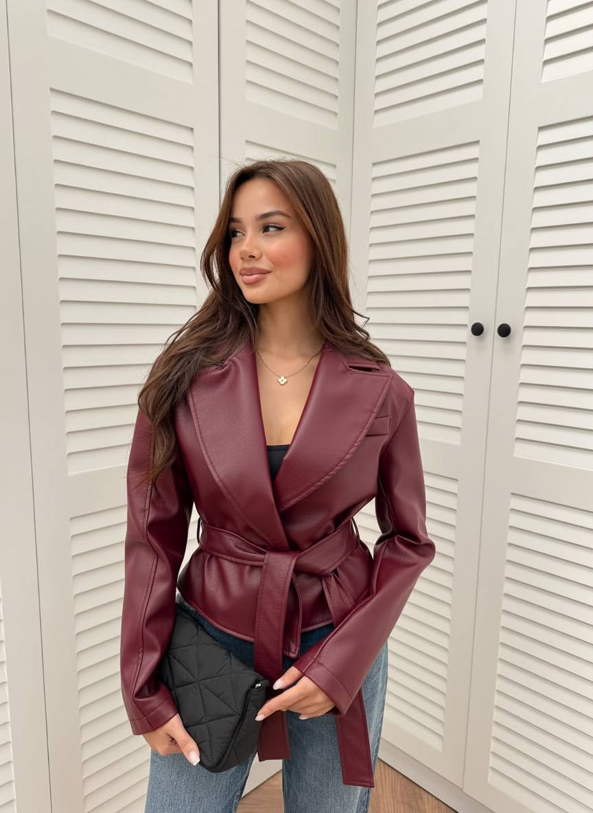 Головна » Магазин » Одяг » Жіночий верхній одяг » Кожаный тренч с поясом на подкладке бордо