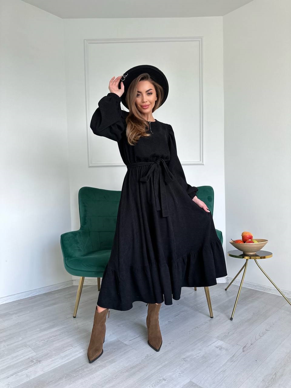 Красивое платье из вельвета с поясом+воланом по низу длиной миди черный