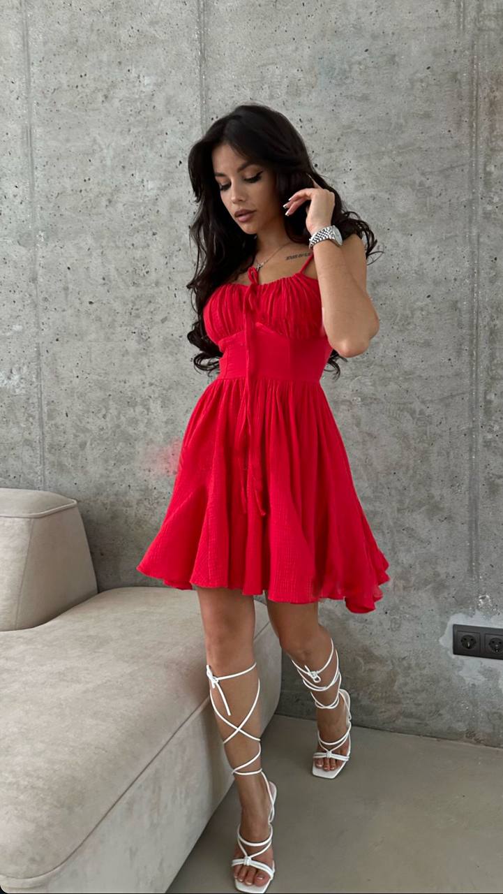 Красивое платье с расклешенной юбкой на тонких бретелях красный