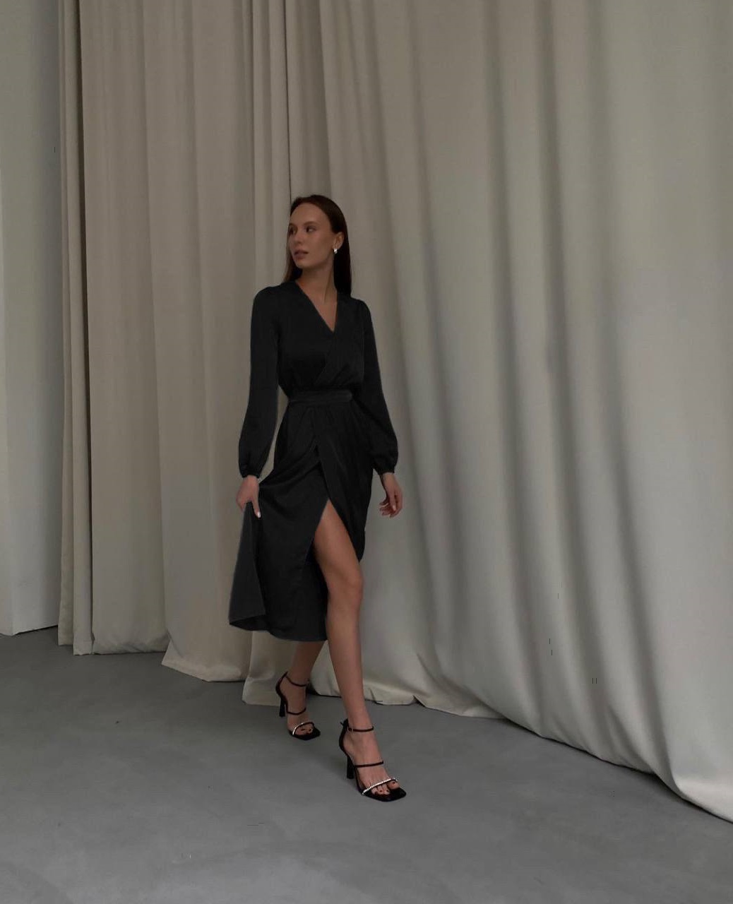 Головна » Магазин » Одяг » Сукня туніка сарафані » Красивое шелковое платье на запах миди черный