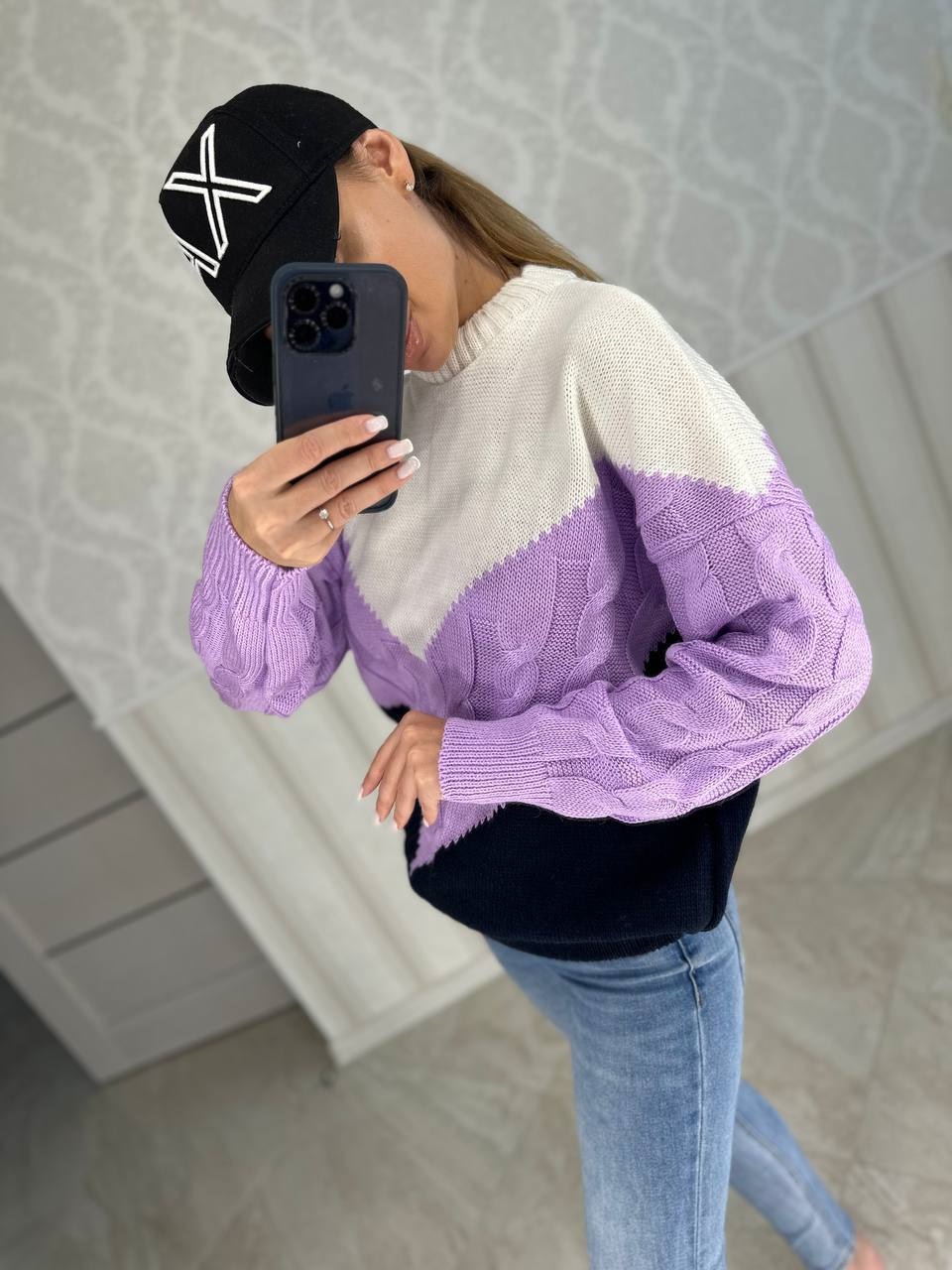 Красивый и качественный свитерок вязка молоко-сиреневый-синий