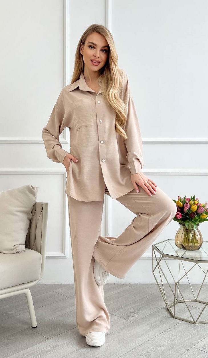 Красивый и очень удобный костюм рубашка + брюки жатка беж