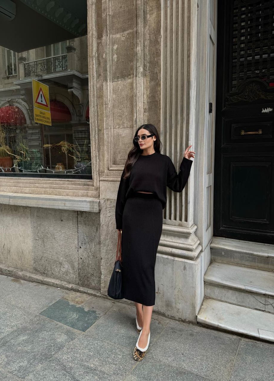 Красивый трикотажный костюм (свитер+расклешенная юбка) черный