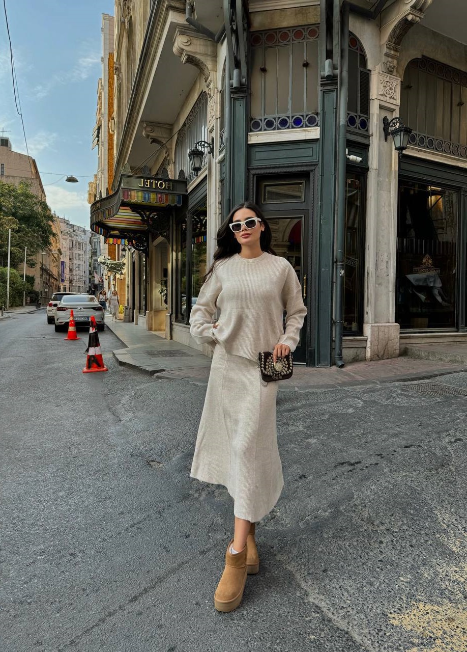Красивый трикотажный костюм (свитер+расклешенная юбка) бежевый