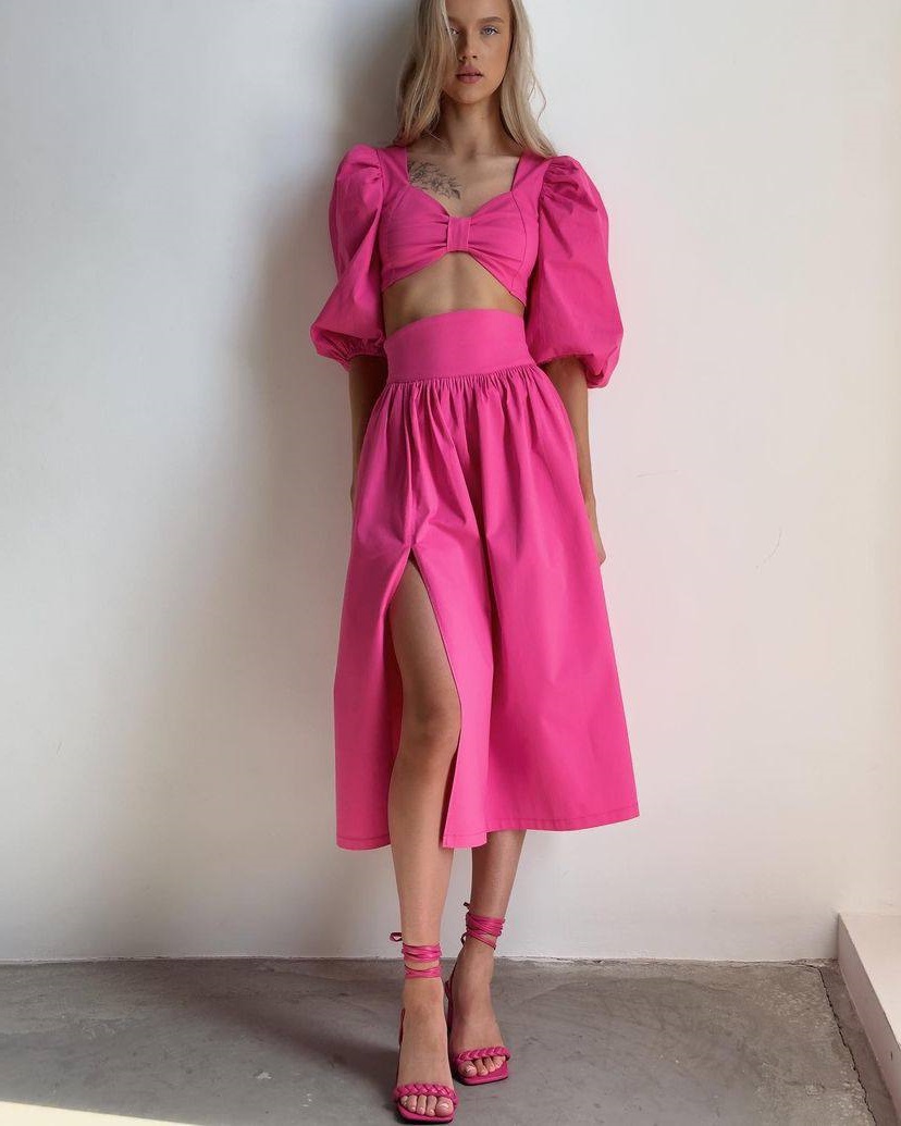 Головна » Магазин » Одяг » Жіночі костюми » Красивый яркий костюм (юбка с разрезом+интересный топ с пышными рукавами) розовый