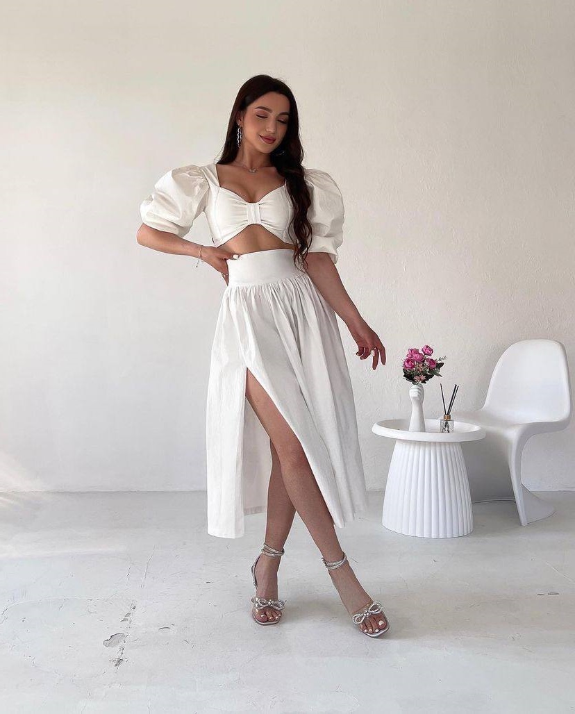 Головна » Магазин » Одяг » Жіночі костюми » Красивый яркий костюм (юбка с разрезом+интересный топ с пышными рукавами) молочный