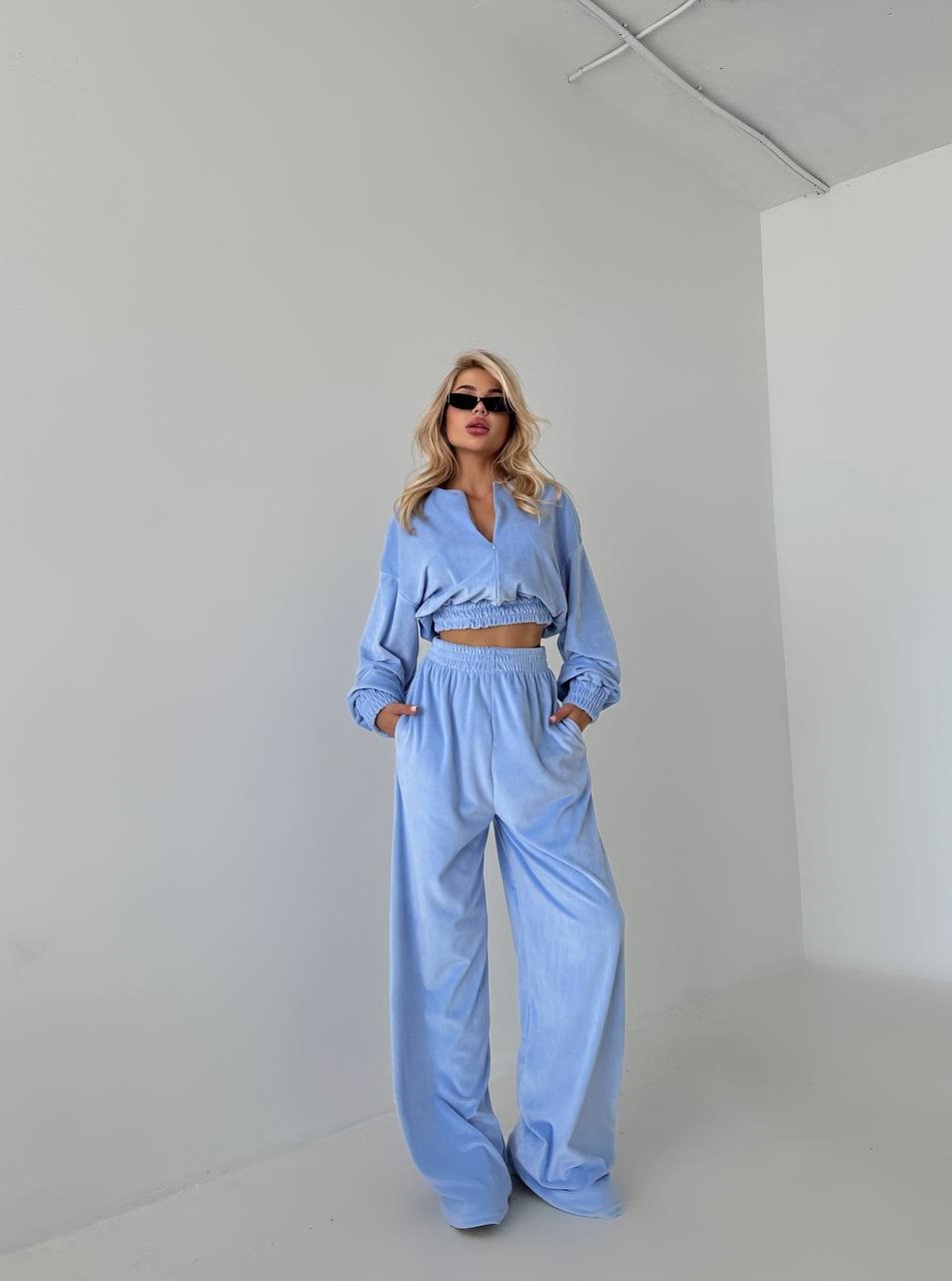 Крутой велюровый костюмчик (укороченная кофта+свободные брюки) голубой