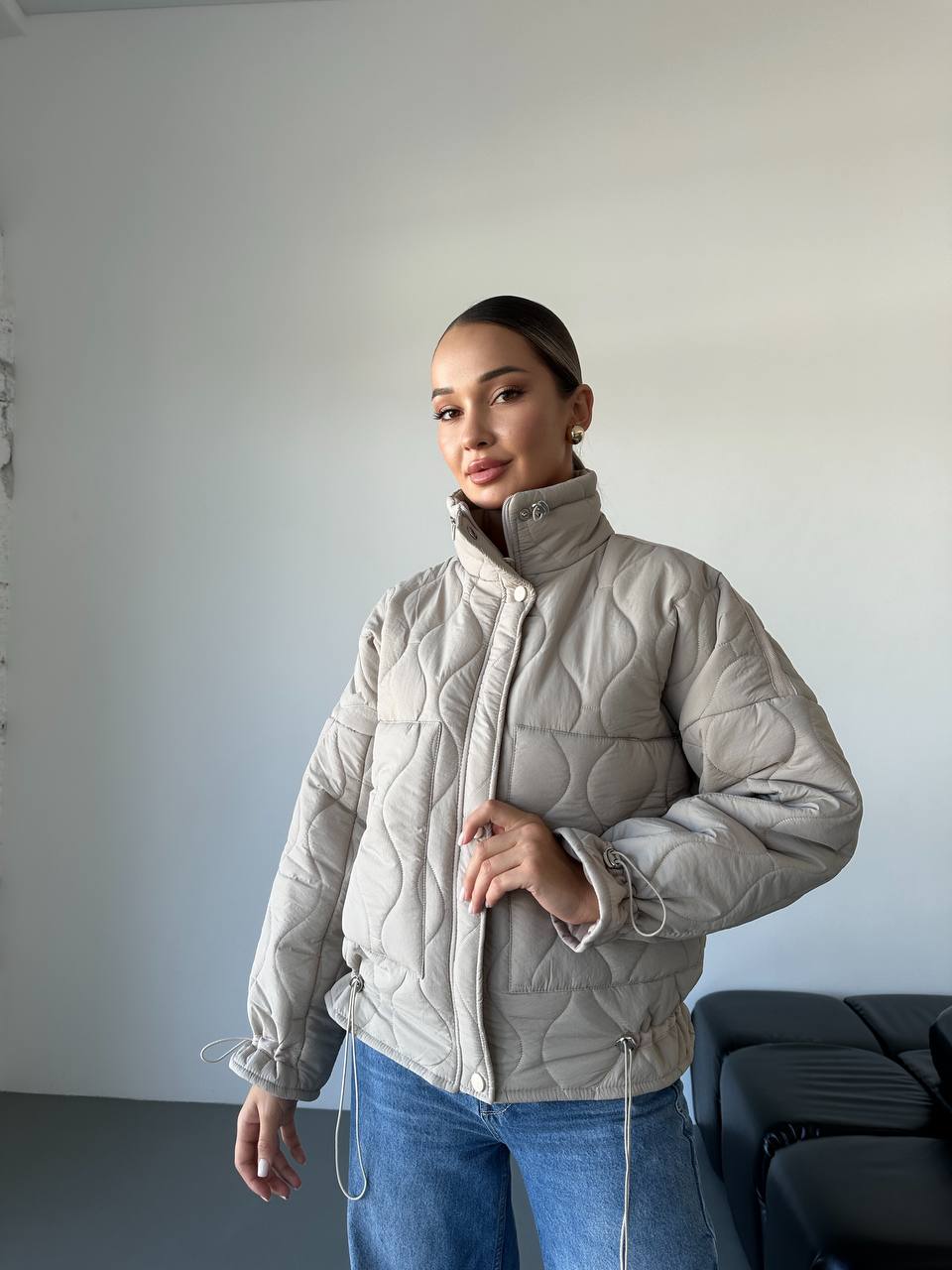 Курточка свободного кроя, со спущенной линией плеча, низ и рукава на резинке с фиксатором, что позволяет корректировать ширину изделия.
