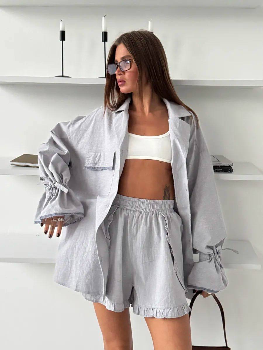 Головна » Магазин » Одяг » Жіночі костюми » Легкий комплект 2-ка: Рубашка+шорты серый
