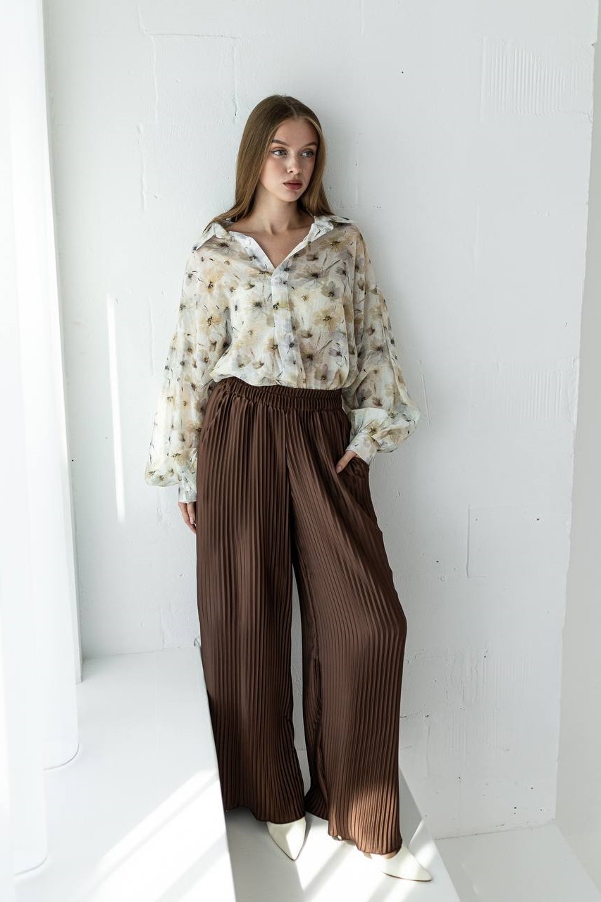 Легкий комплект с широкими шелковыми брюками-плиссе+полупрозрачной рубашкой шоколад