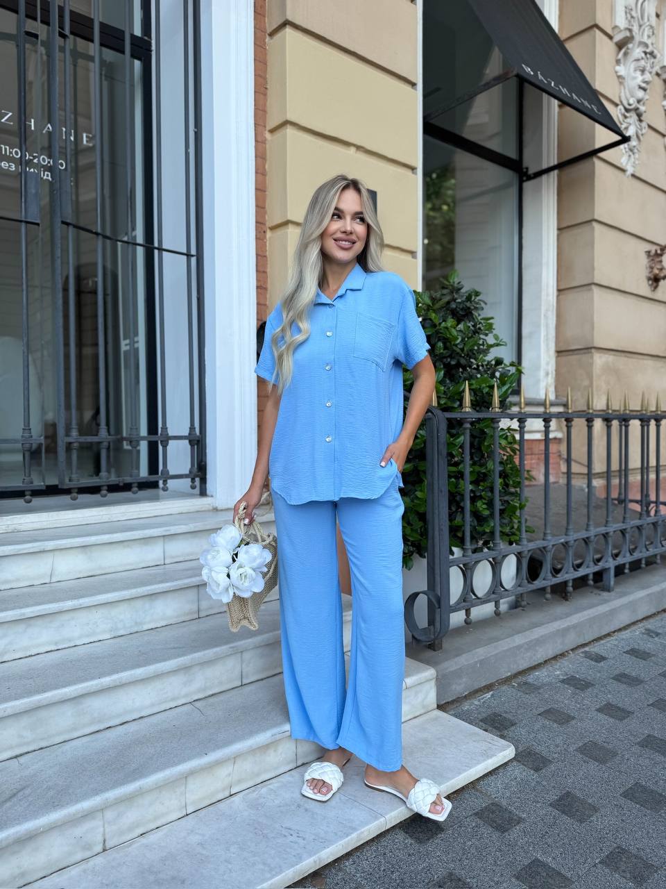 Костюм (брюки + рубашка и майка) Цвет: голубой, лаванда, пудра, малина, серый Ткань : креп жатка Размеры: S, M, L, XL