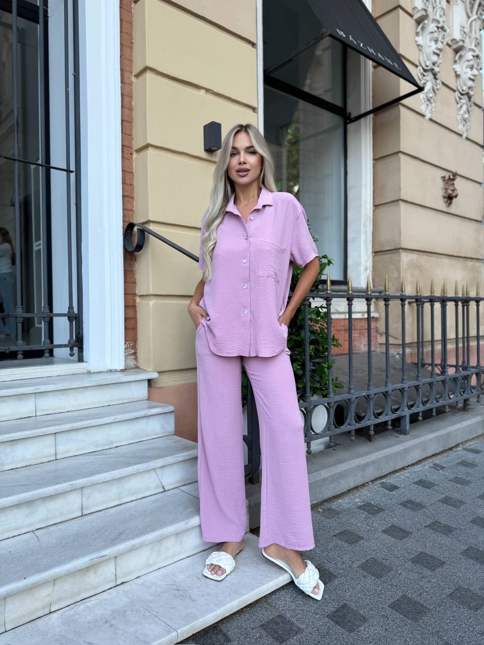 Костюм (брюки + рубашка и майка) Цвет: голубой, лаванда, пудра, малина, серый Ткань : креп жатка Размеры: S, M, L, XL