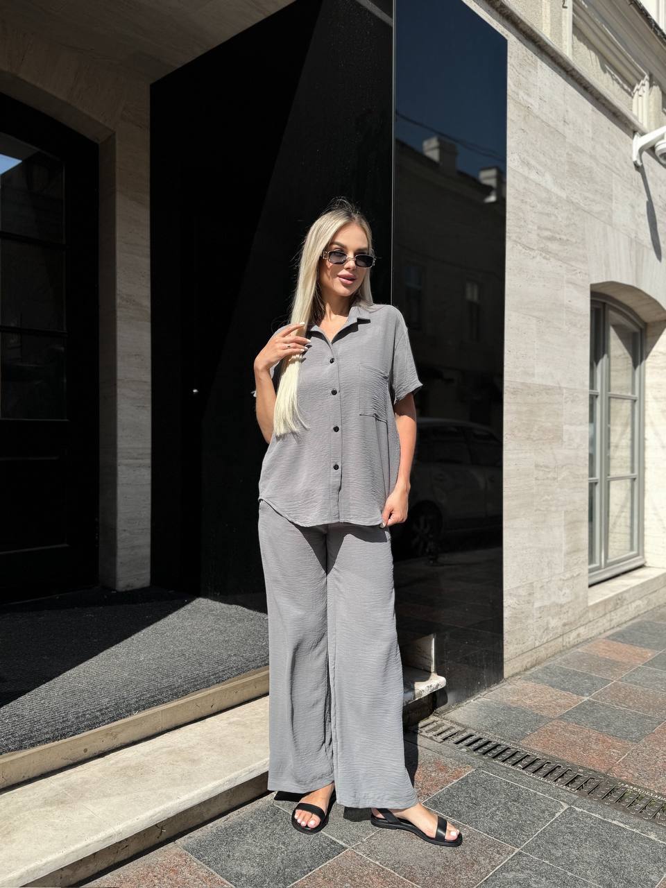 Костюм (брюки + рубашка и майка) Цвет: голубой, лаванда, пудра, малина, серый Ткань : креп жатка Размеры: S, M, L, XL