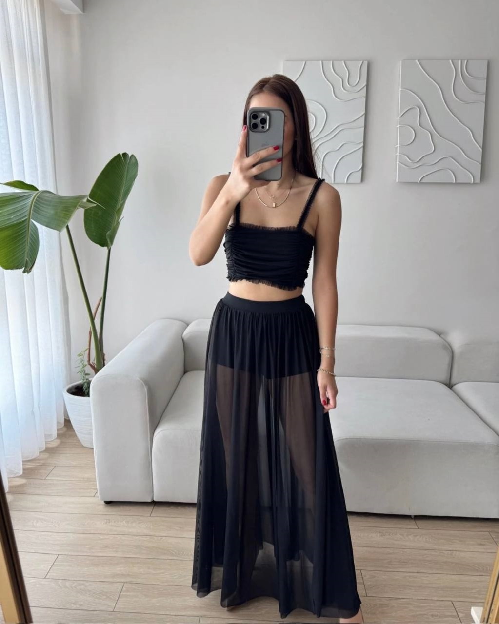 Головна » Магазин » Одяг » Жіночі костюми » Легкий костюм для жарких дней (топ на бретелях+юбка с шортиками) черный