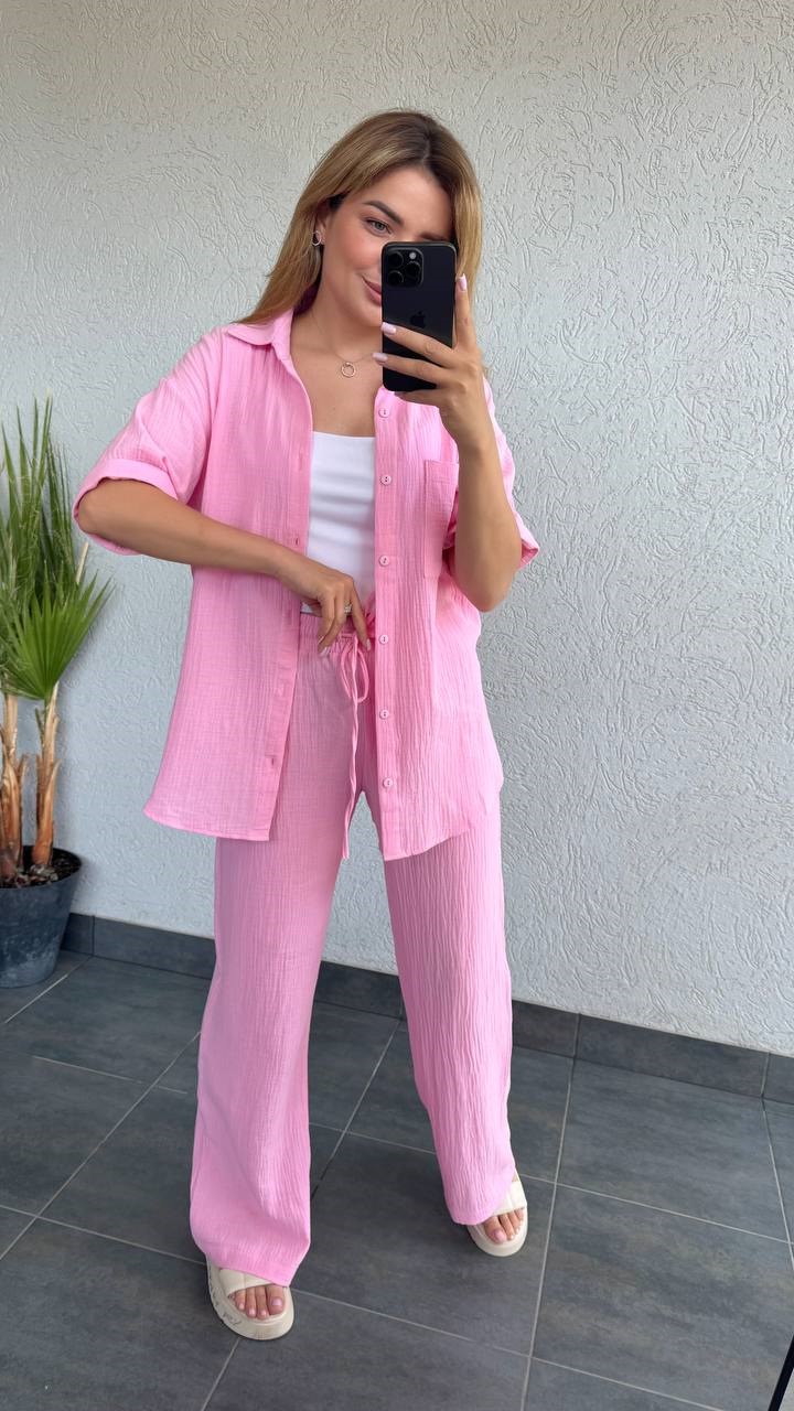 Легкий Костюм из муслина (брюки свободного кроя+рубашка прямого кроя) розовый