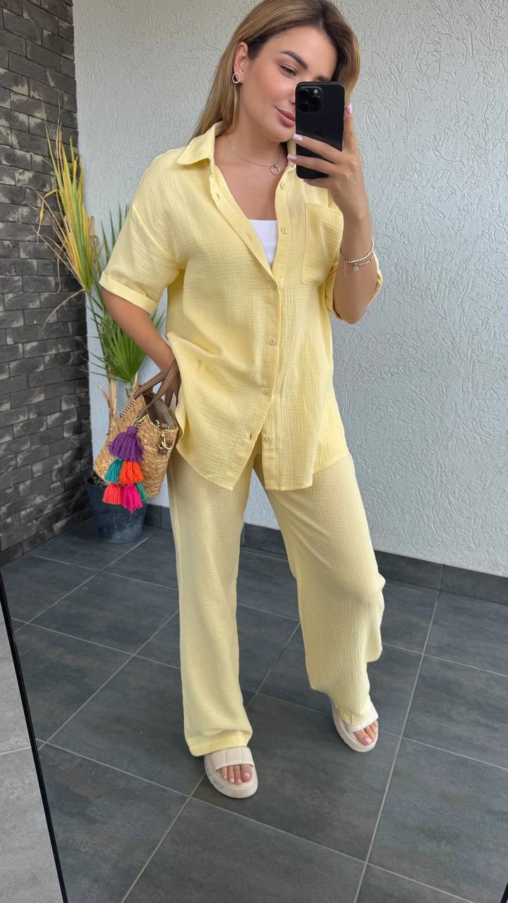 Костюм из муслина, брюки свободного кроя, талия на резинке и веревке, с карманами.