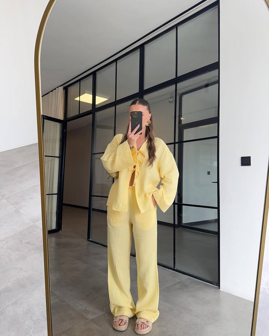 Легкий костюм из муслина (кофта свободного кроя на завязочках+брюки с карманами) желтый